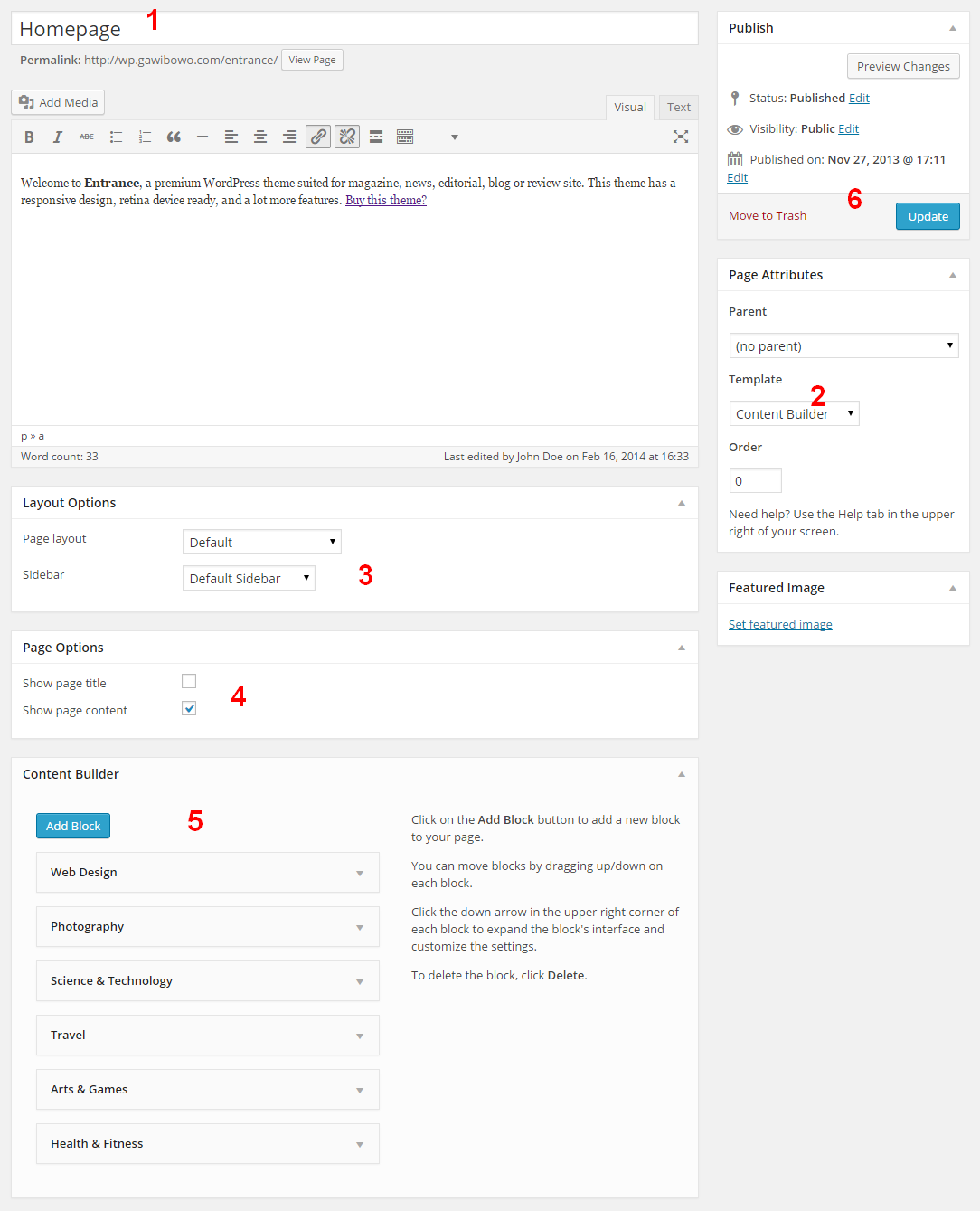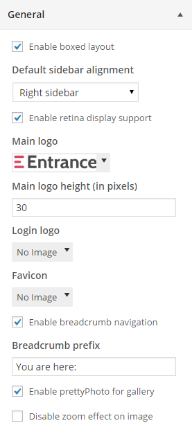 Upload the entrance folder to your wp-content/themes folder. Login to your WordPress admin panel and go to Appearance > Themes. Activate the theme.