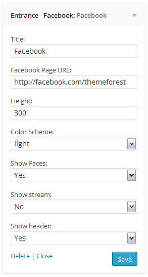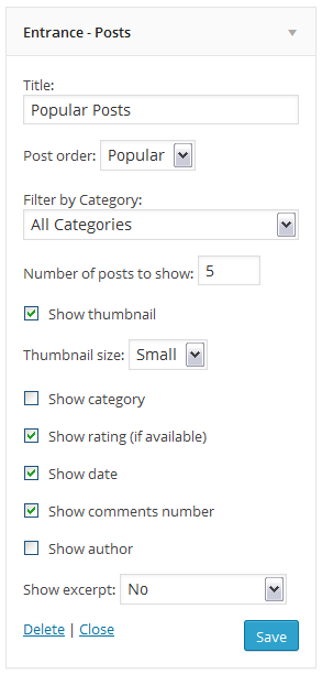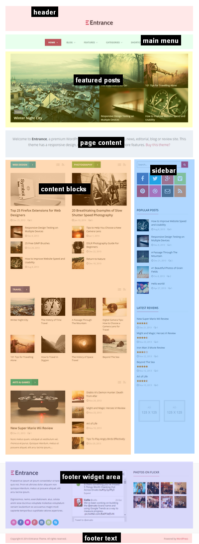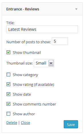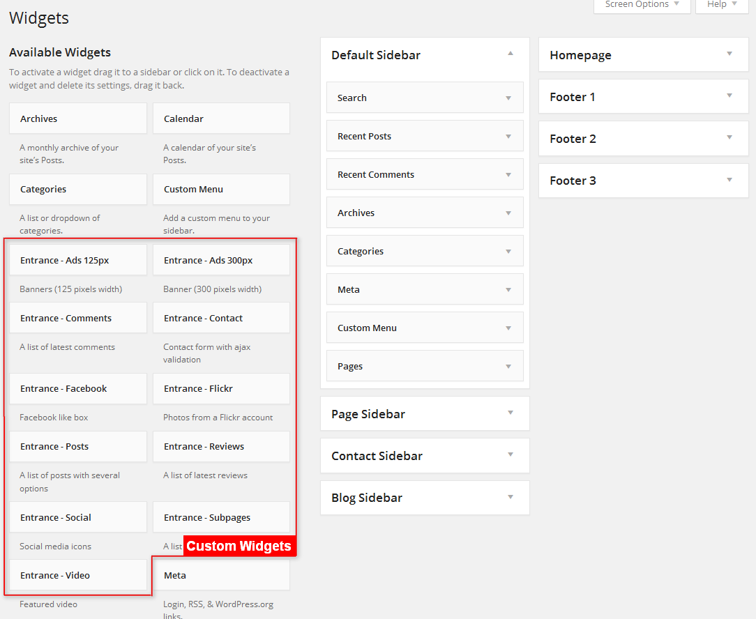 As an addition to the built-in WordPress widgets, this theme also has custom widgets: Ads 125px, Ads 300px, Comments, Contact, Facebook, Flickr, Posts, Reviews, Social, Subpages, Video.