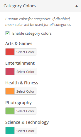 Below the main color, you can also set custom color for categories. If you enable this option, each category can have different colors. If disabled, main color will be used for all categories.