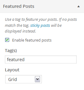 This section is for Featured Posts customization. If enabled, the Featured Posts will appear on the homepage. Featured Posts come from posts with a user defined tags (default tag is "featured") or sticky posts.