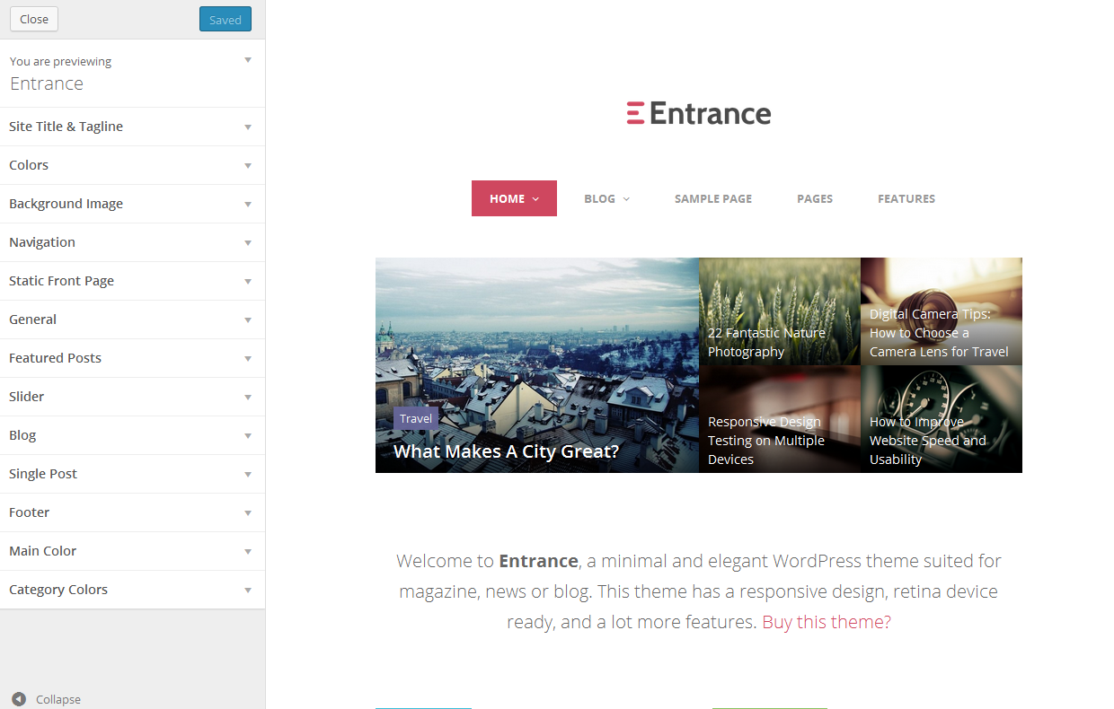 WordPress already has some settings in the customizer and this theme added more sections: General, Header, Featured Posts, Slider, Blog, Single Post, Footer, Main Color and Category Colors.