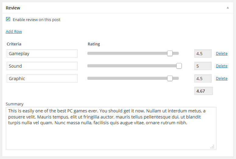 To add a review post, create a standard post and click on the "Enable review on this post". You can add as many rating as you want. Overall rating will be calculated automatically.