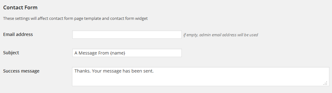 In this section you can set email address, subject and success message for contact page template and contact form widget.