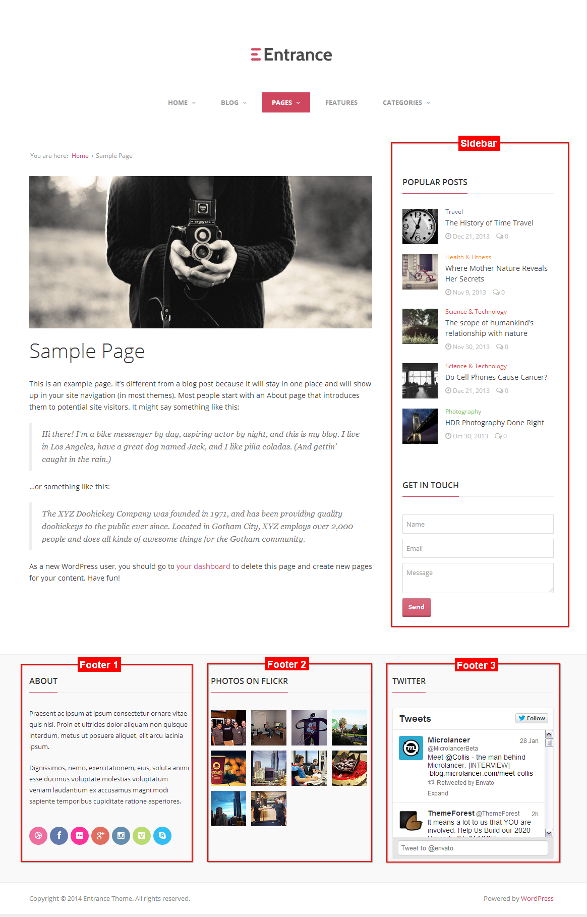 This theme has 3 widget areas for footer and 1 default sidebar. More sidebars can be added from Theme Options » Sidebar Manager.