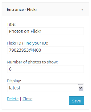 Flickr widget allows you to add recent images uploaded to your flickr account. You can customize your Flickr ID, number of photos to show and the display order (latest/random) from the widget settings. To find your Flickr ID, use http://idgettr.com