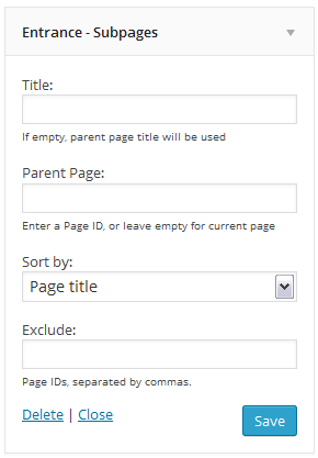 Subpages widget allows you to show child pages of current page or any page. You can customize parent page (Enter a Page ID, or leave empty for current page), sort by and exclude page IDs from the widget settings.