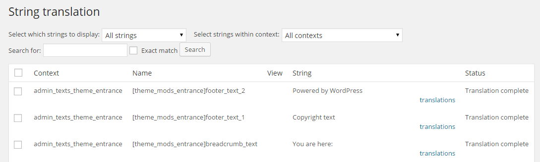 You can also translate texts from Theme Options (Contact Form Subject, Contact Form Success Message) and Theme Customizer (Breadcrumb Text, Footer Text 1, Footer Text 2). They will be under this context: admin_texts_theme_entrance.
